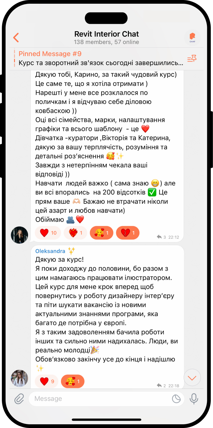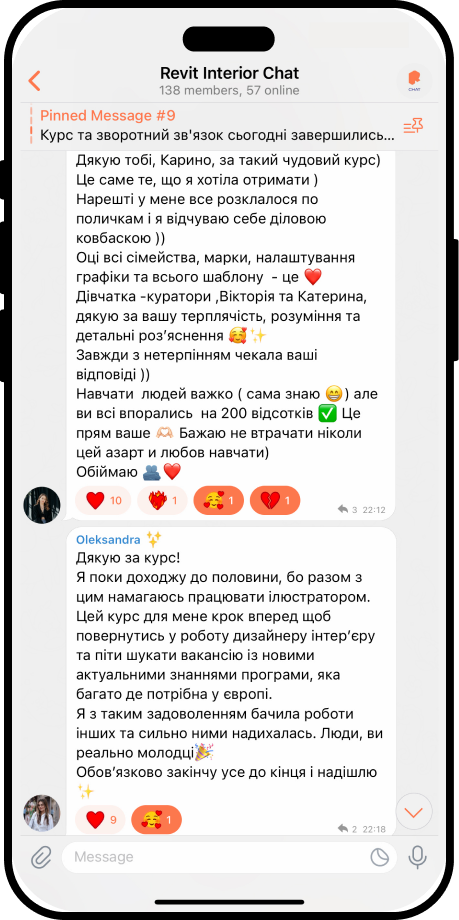 «Я в неймовірному захваті від курсу! Вважаю що це було найкращим рішенням навчитися роботі в Ревіті і обрати для цього саме курс Карини! Дуже зрозуміла подача інформації, все чітко, структуровано, постійна підтримка на курсі по всім питанням, навіть по дуже дріб’язковим. Що мені також ну дуууже сподобалось - це сама платформа і організація роботи на курсі.